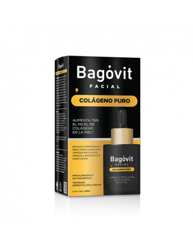 El Serum Colágeno Puro de Bagóvit rellena arrugas instaladas, mejora la elasticidad, la firmeza y la luminosidad de la piel. Además, hidrata en profundidad, tonificando la piel. Está especialmente formulado para aumentar un 76% el nivel de colágeno en la piel aportando cohesión, resistencia y fortaleza a los tejidos. Está dermatológicamente testeado, es hipoalergénico, sin parabenos y no testeado en animales. Además, es sin TACC.
