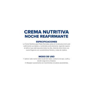 Nutre en profundidad, hidrata por 72 h. y repara los tejidos de colágeno y elastina. Previene el envejecimiento prematuro de la piel. Indicada para piel normal a seca.