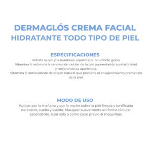 La Crema Facial Hidratación Diaria de Dermaglós está diseñada para hidratar profundamente y mantener el equilibrio natural de la piel durante todo el día, sin dejar sensación grasa. Gracias a su fórmula liviana y de rápida absorción, deja la piel suave, luminosa y protegida frente a factores externos. Enriquecida con vitamina A y vitamina E, estimula la renovación celular y previene el envejecimiento prematuro, siendo ideal para usar todos los días en cualquier tipo de piel, incluso la más sensible.