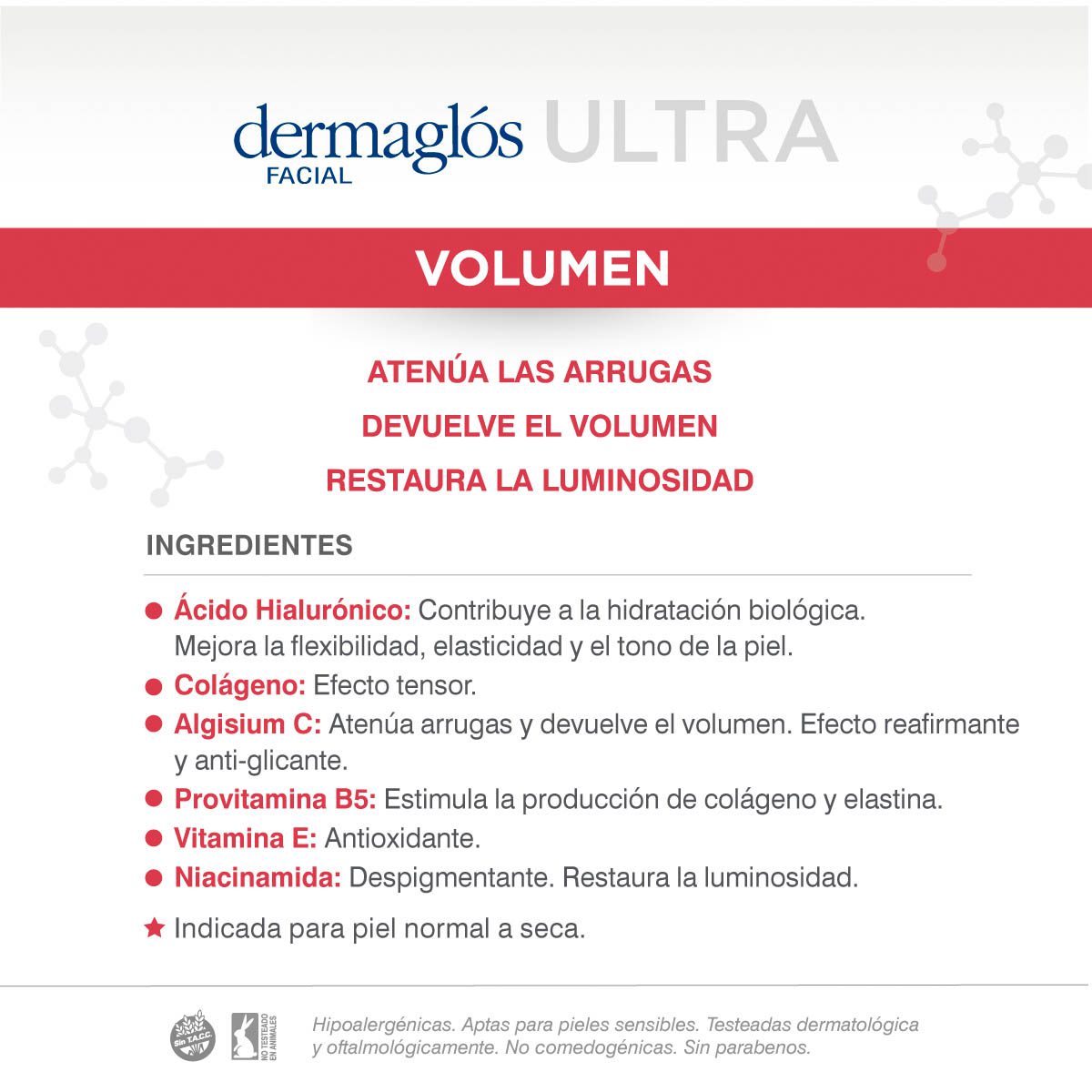 Formulada para hidratar y atenuar arrugas. Mejora la elasticidad y aporta firmeza, perdidas por la disminución de la producción de colágeno y ácido hialurónico. Protege con FPS30. Indicado para piel normal a seca.