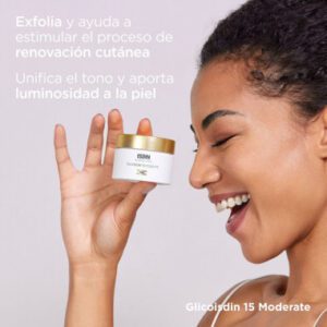 Crema facial formulada con un 15% de ácido glicólico parcialmente neutralizado (equivalente a 6,1% de ácido glicólico libre) que exfolia la superficie de la piel, ayudando a suavizar su textura y a estimular el proceso de renovación cutánea.