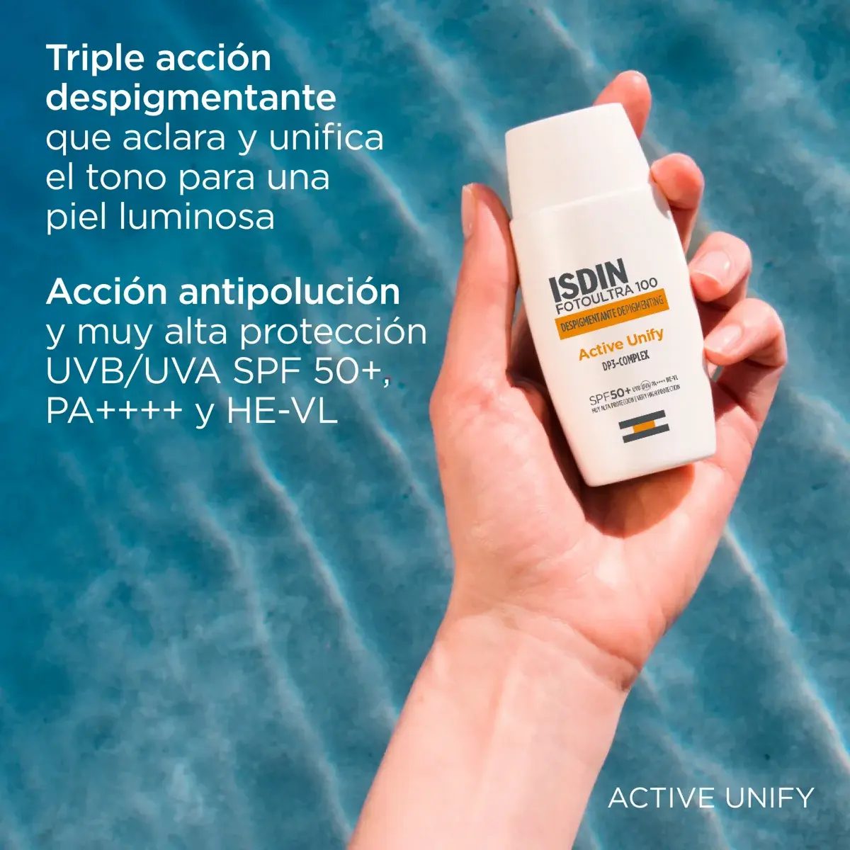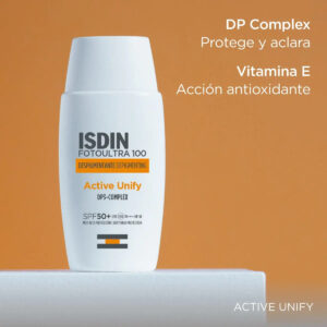 FotoUltra Isdin Fusion Fluid SPF50+ Active Unify es un fluido facial con tecnología Fusión, que se fusiona con la piel, con acción despigmentante porque regula la producción de melanina por tres mecanismos distintos. Aclara y unifica el tono de la piel gracias a sus diferentes e innovadores activos.