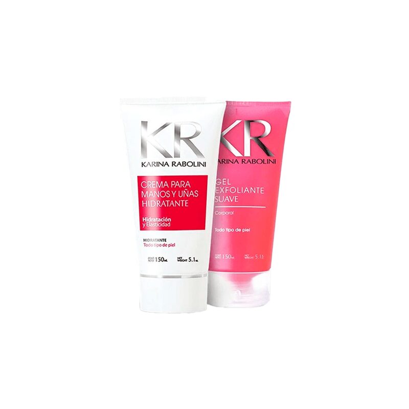Karina Rabolini Love Gift Crema de Mano de 150ml + Gel Exfoliante de 150ml Crema de Manos Nutritiva Reduce la deshidratación de la piel y evita el envejecimiento gracias a las propiedades de la manteca de cacao y el aporte de la vitamina E como antioxidante. Gel Exfoliante Suave Contiene activos hidratantes y partículas exfoliantes que limpian las impurezas de la piel, devolviendo suavidad y luminosidad.
