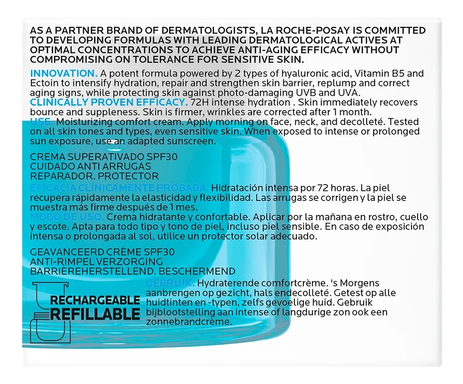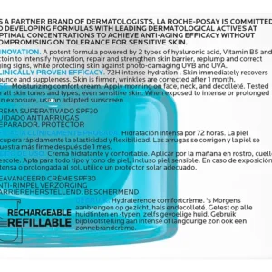La Roche-Posay Hyalu B5 Suractinated Cream SPF30 50 ml es una crema facial anti-edad que combina ácido hialurónico puro y vitamina B5 con protección solar de amplio espectro SPF30. Rellena visiblemente arrugas y líneas de expresión, mejora la elasticidad de la piel y la protege contra el fotoenvejecimiento causado por los rayos UV. Su fórmula suave y de rápida absorción aporta hidratación intensa, reparación de la barrera cutánea y defensa diaria contra agresores externos, siendo ideal incluso para pieles sensibles.