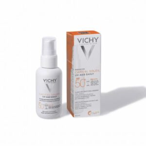 Vichy Capital Soleil UV-AGE Daily con Color SPF50+ es un fluido antienvejecimiento de muy alta protección frente a los rayos UVA, UVB y la luz visible, diseñado para proteger, corregir y mejorar visiblemente la piel. Su fórmula avanzada combate los signos del envejecimiento, unifica el tono y mejora la luminosidad.
