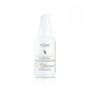 Vichy Capital Soleil UV-AGE Daily con Color SPF50+ es un fluido antienvejecimiento de muy alta protección frente a los rayos UVA, UVB y la luz visible, diseñado para proteger, corregir y mejorar visiblemente la piel. Su fórmula avanzada combate los signos del envejecimiento, unifica el tono y mejora la luminosidad.