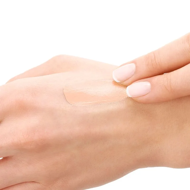 1. Preparar: Aplicar una pequeña cantidad de base de maquillaje en la palma de la mano y calentar la textura con la yema de los dedos mediante pequeños movimientos circulares.